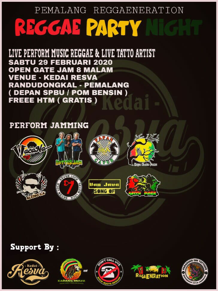 Hal itulah yang akan segera terrealisasikan di Kabupaten Pemalang. Para Aktor, Pemain musik, hingga para Fans yang menggandrungi musik reggae terlihat bekerjasama membuat event besar bertajuk “Reggae Party Night”. Event yang dipastikan akan menggemparkan Kabupaten Pemalang ini menjadi pembangkit semangat para fans aliran musik Reggae yang selama ini teramat sangat rindu akan penampilan grup band reggae idolanya. Event yang dipastikan sebagai pembuka gelaran musik reggae di Tahun 2020 ini, bakal diisi oleh penampilan puluhan grup band papan atas yang seringkali tampil memukau di setiap acara.