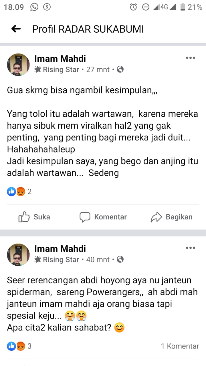 Sukabumi, – Kata–kata dari sebuah postingan dengan nama Akun Imam Mahdi di sebuah Group Fb, yang menghina Wartawan dengan sebutan Tolol dan Anj*ng membuat para wartawan merasa direndahkan.
