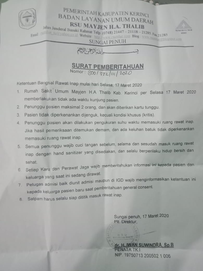 “Benar adanya Pemberitahuan ini, kami dari pihak Rumah Sakit Umum mengharapkan pengertian dan kerja sama dari segenap masyarakat dalam antisipasi masalah ini, mari sama- sama kita dukung kebijakan yang dikeluarkan Bupati Kerinci melalui Direktur RSU MH.A Tahalib Daerah Kabupaten Kerinci Iwan Suwindra”, terangnya dengan singkat.