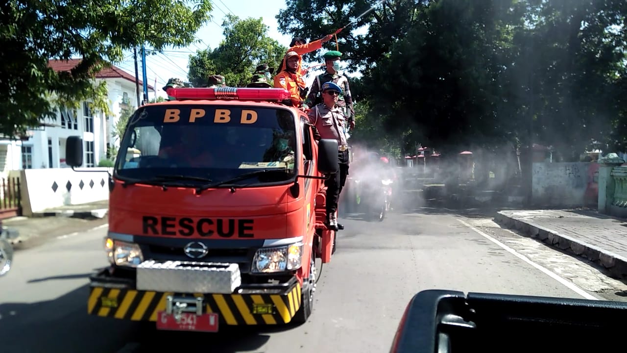 Pemalang, – untuk pencegahan virus covid 19 atau Corona pemerintahan Kabupaten Pemalang (Pemkab) bersama Badan Penanggulangan Bencana Daerah (BPBD), TNI, POLRI, melakukan penyemprotan disinfectan, di fasilitas umum dengan rute dari Jl Ayani, Jl Jendralsuderman, Jl Kolonel Sudiono, Jl Piere Tandean, Jl Pemuda, Jl Gatot subroto, dan Jl Surohadikusumo, dengan kafasitas 10.000,000 liter, dengan mengunakan 2 truk tangki milik BPBD Pemalang 27/3/20 pagi.