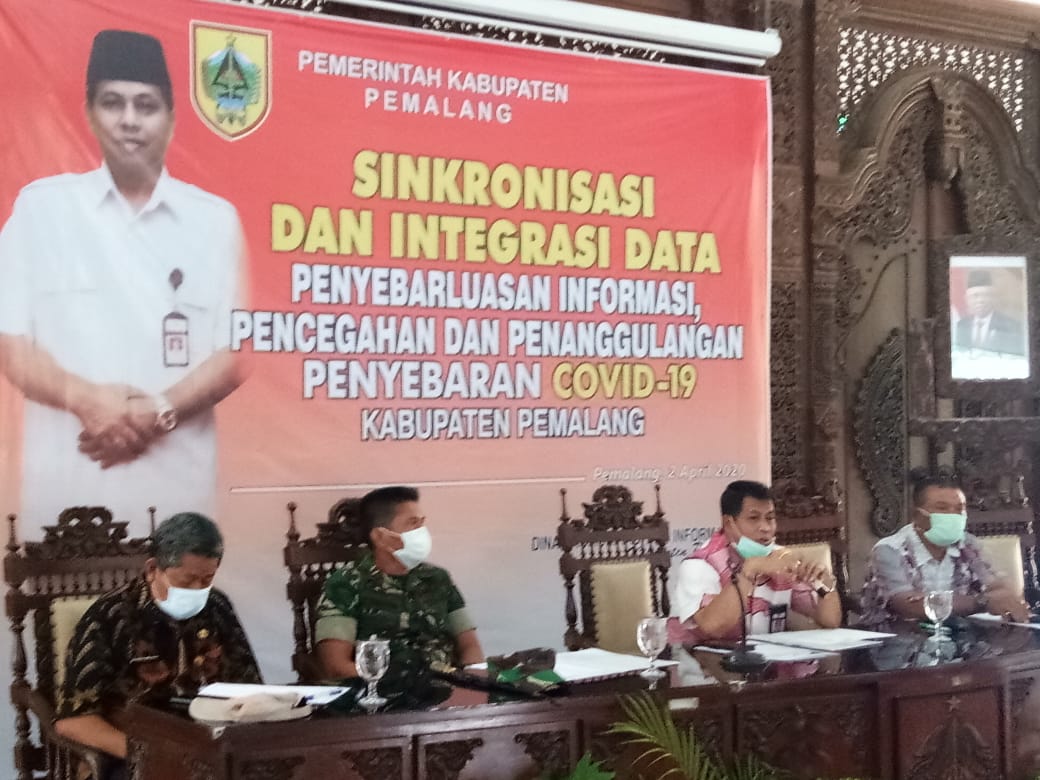 Pemalang, – Bupati Pemalang H. Junaedi di dampingi Forkopimda dan Sekertaris Daerah (Sekda) Muhammad Arifin,  memberikan arahan tentang singkonisasi integrasi data di tingkat Desa melalui Video conference yang ada pada 17 titik, Antara lain Pendopo Kabupaten, Gedung Sasana Bhakti Praja, RSUD DR. M. Ashari dan 14 titik Kecamatan, kamis 2/4/20. Pagi