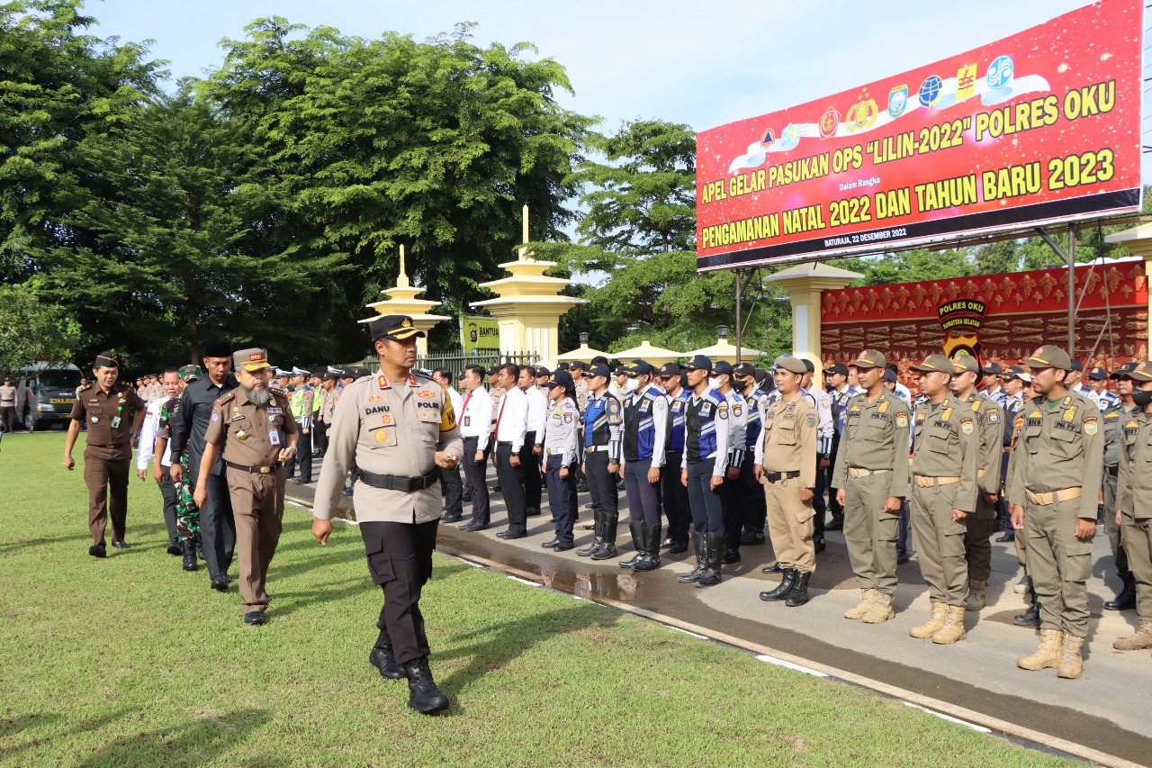 Kegiatan Apel Gelar Pasukan Ops “Lilin-Musi 2022” Polres Oku Pengamanan Natal 2022 Dan Tahun Baru 2023 selaku Inspektur Upacara AKBP Danu Agus Purnomo S.I.K., M.H dan juga dihadiri oleh Dandim 0403 OKU, diwakili oleh Pasi Ops Lettu Inf Setia Winardi, Ketua DPRD OKU diwakili Wakil II DPRD Kab. OKU, Yoni Risdianto, SH, Sekertaris Daerah Kab. OKU, Dr. Drs. Ir. H. A. Tarmizi, SE, ST, SH, MT, M.Si, MH, M.Pd, Ph.D (HC), Kajari OKU diwakili Kasi Intelijan Variska Ardina Kodriansyah,S.H.M.H, Kepala BPBD OKU Amzar Kristofa M.Si, PJU Polres OKU dan Kapolsek Jajaran Polres OKU.