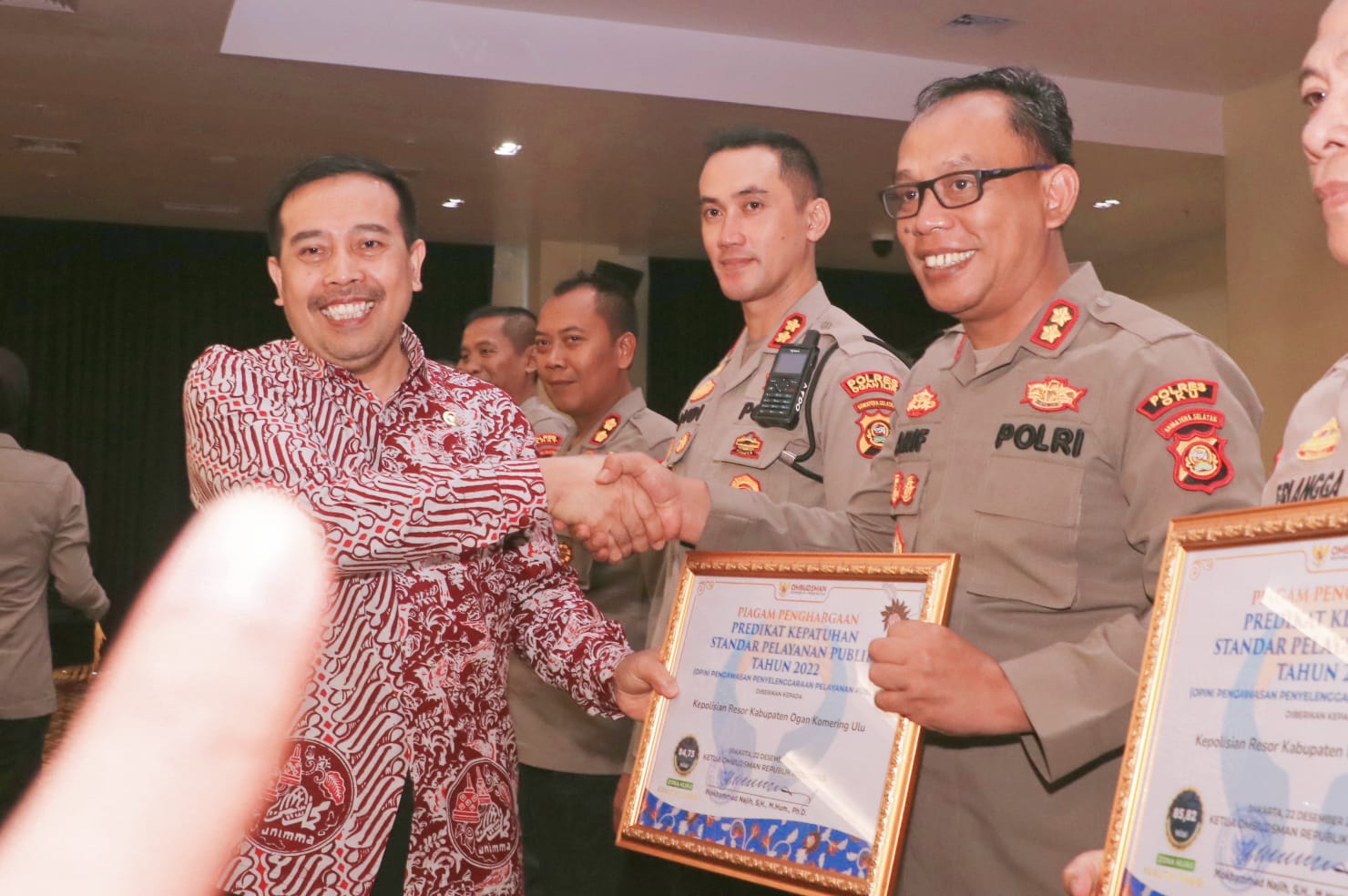 OKU SUMSEL, – Kapolres Oku Akbp Arif Harsono, S.I.K., M.H., menghadiri kegiatan penganugerahan predikat kepatuhan standar pelayanan publik tahun 2022 tingkat Polda Sumsel oleh Ombusman RI. Rabu 01/02/2023 bertempat diruang Presisi lantai VII Polda Sumsel.
