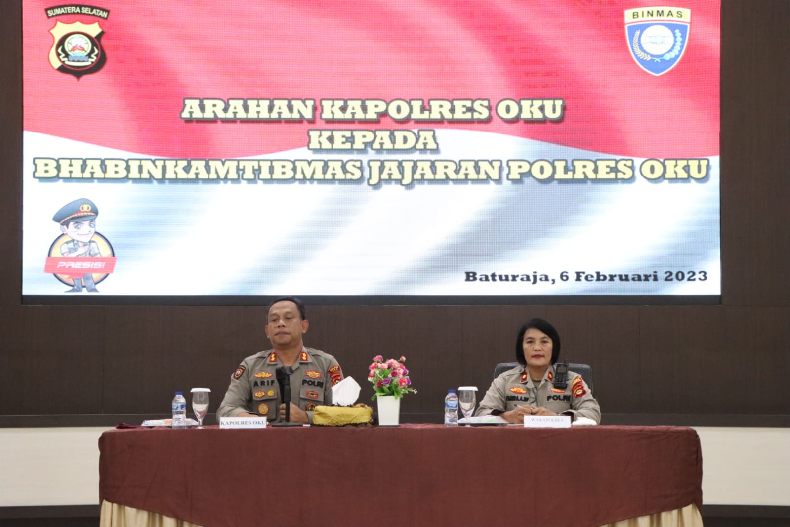 OKU SUMSEL, – Kapolres Oku Akbp Arif Harsono, S.I.K., M.H., dengan didampingi Waka Polres OKU Kompol Farida Aprillah, S.H., memberikan arahan dan bimbingan kepada Bhabinkamtibmas jajaran Polres OKU di Gedung Wira Satya Ruang Multimedia Wicaksana Laghawa Polres OKU. Senin (06/02/2023) sekira pukul. 16.00 Wib.