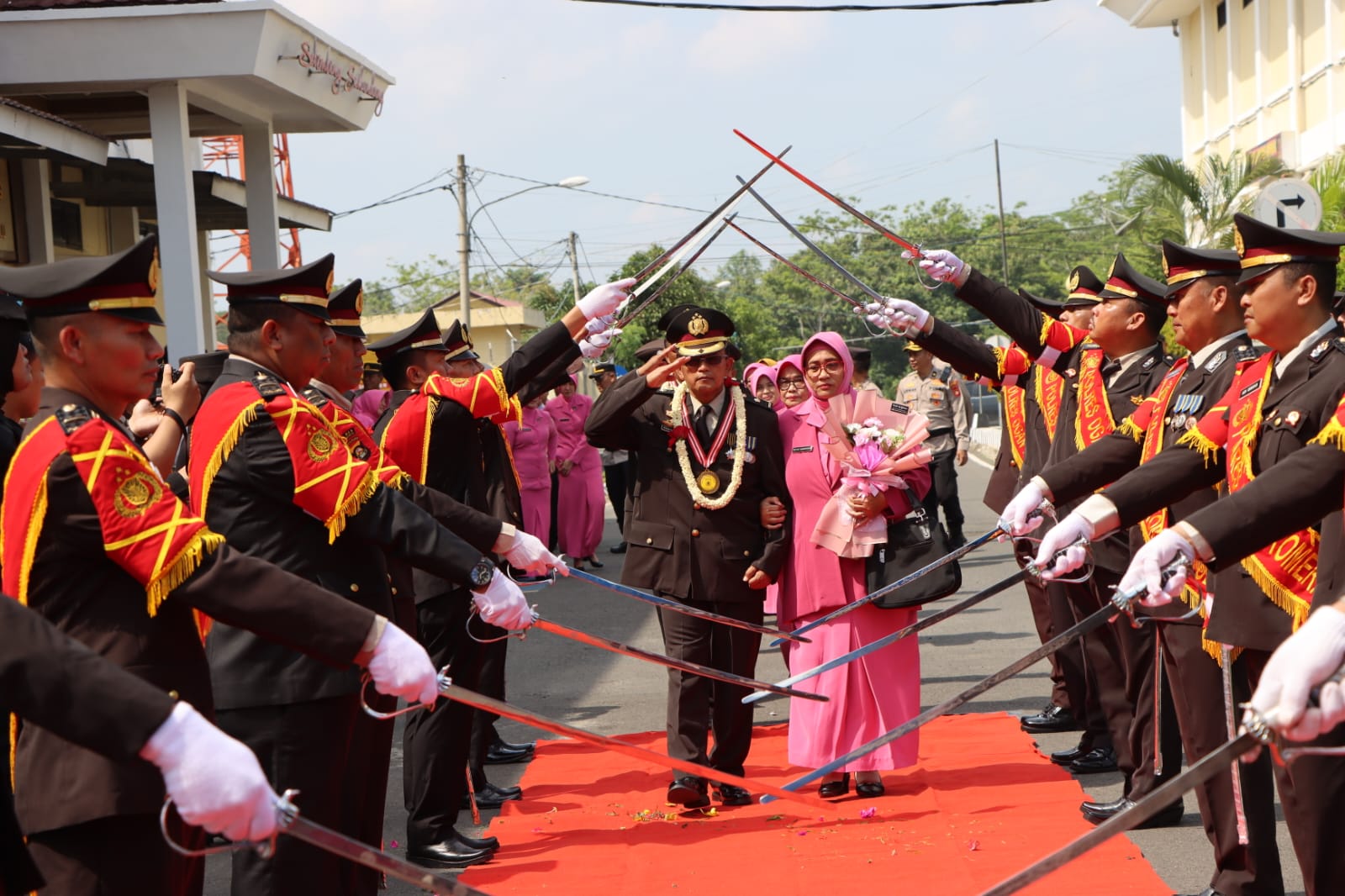 Kemudian Personel Purna Bhakti diantaranya, Kompol Sumaryono, Kompol Masdar, AKP Bastari, AKP Herman dan 8 anggota serta 1 orang ASN ini dilepas dengan tradisi pedang pora.