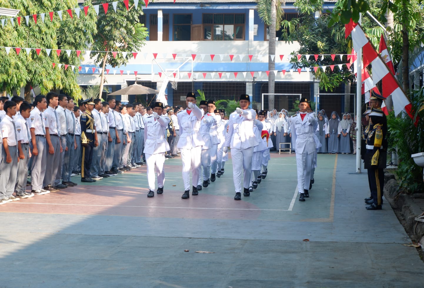 Dengan semangat nasionalisme yang membara, seluruh siswa dan guru-guru SMKS Bina Prestasi tampak mengenakan pakaian seragam dengan penuh kebanggaan.