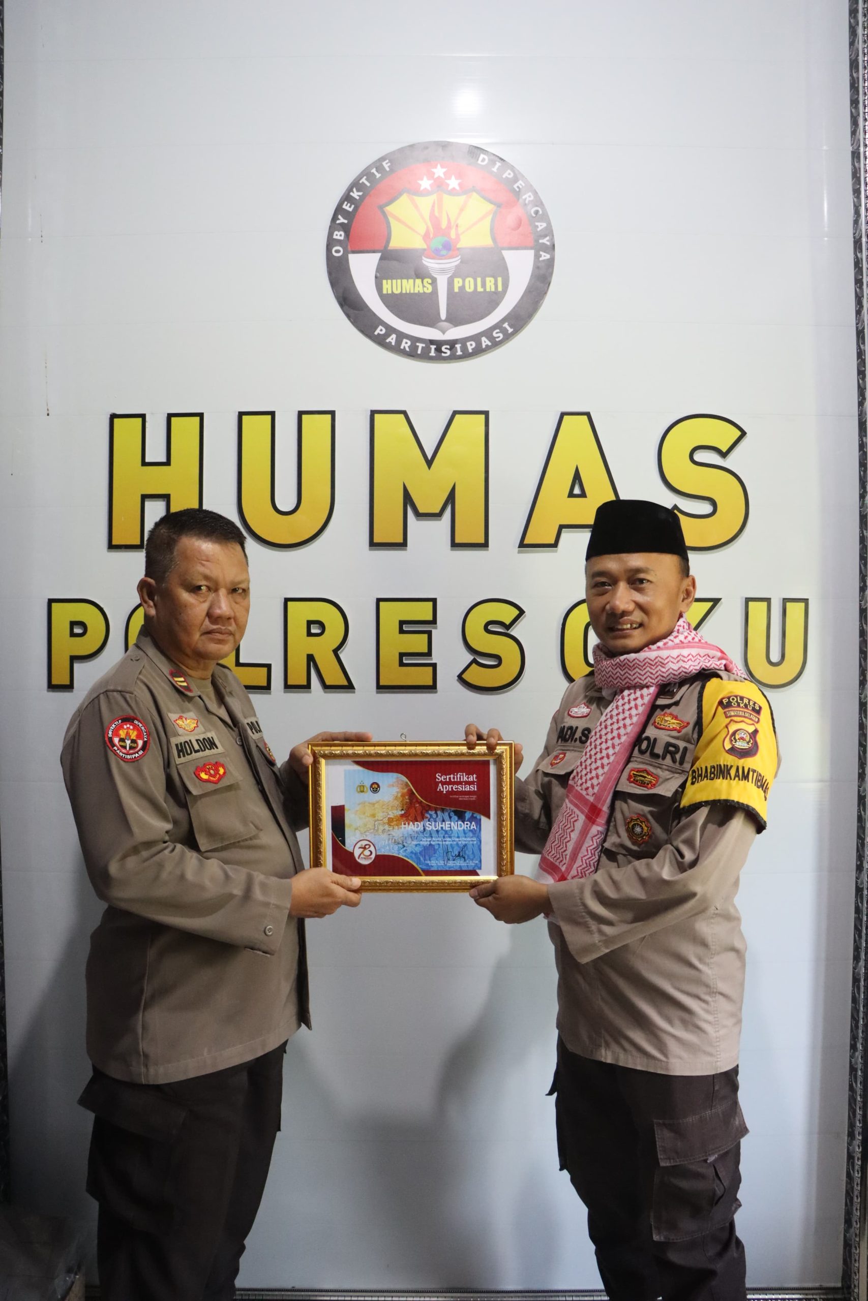 Sertifikat Apresiasi diserahkan oleh Kapolres OKU AKBP Imam Zamroni, S.Ik,MH, melalui kasi humas Iptu Ibnu Holdon, Jum’at (9/8/2024).