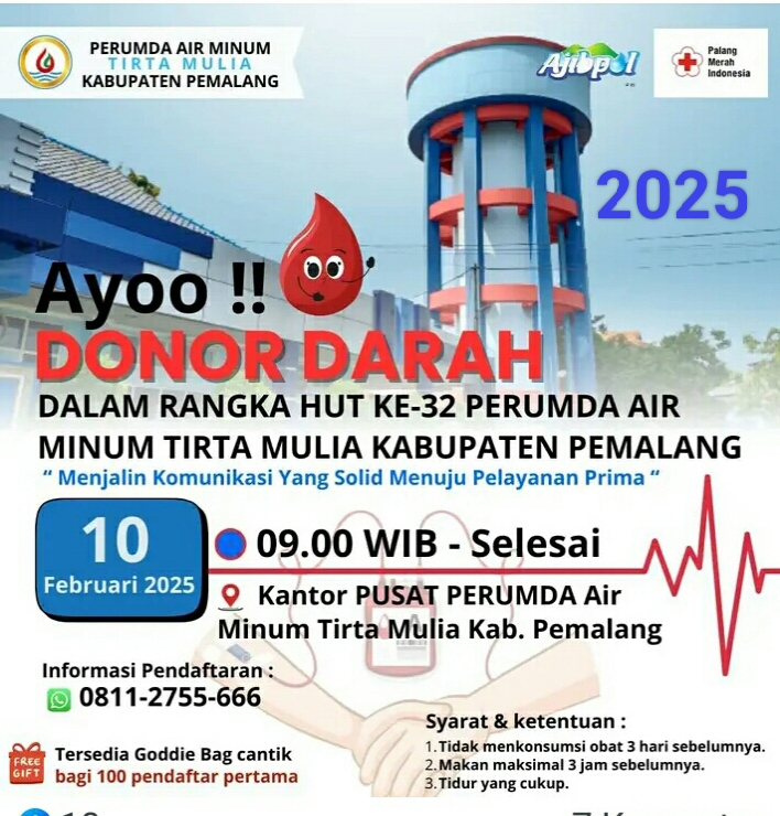 Pemalang – Dalam rangka memperingati Hari Ulang Tahun (HUT) ke-32 Tahun 2025, PERUMDA Air Minum “Tirta Mulia” Kabupaten Pemalang akan menyelenggarakan kegiatan donor darah. Kegiatan ini terbuka bagi pegawai dan pelanggan, serta akan dilaksanakan di kantor Pusat PERUMDA Air Minum Tirta Mulia di Jalan Gatot Subroto No. 30 , Pemalang. Bagi 100 pendaftar pertama, akan disediakan goodie bag cantik sebagai apresiasi. Pelaksanaan kegiatan donor darah ini akan berlangsung pada tanggal 10 Februari 2025, mulai pukul 09.00 hingga selesai.Pemalang – Dalam rangka memperingati Hari Ulang Tahun (HUT) ke-32 Tahun 2025, PERUMDA Air Minum “Tirta Mulia” Kabupaten Pemalang akan menyelenggarakan kegiatan donor darah. Kegiatan ini terbuka bagi pegawai dan pelanggan, serta akan dilaksanakan di kantor Pusat PERUMDA Air Minum Tirta Mulia di Jalan Gatot Subroto No. 30 , Pemalang. Bagi 100 pendaftar pertama, akan disediakan goodie bag cantik sebagai apresiasi. Pelaksanaan kegiatan donor darah ini akan berlangsung pada tanggal 10 Februari 2025, mulai pukul 09.00 hingga selesai.
