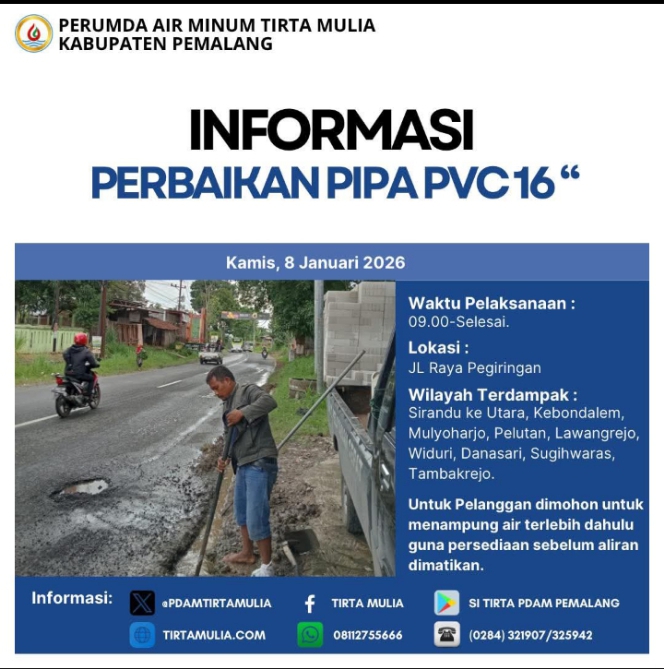 Perumda Air Minum Tirta Mulia Kabupaten Pemalang memohon maaf atas ketidaknyamanan yang ditimbulkan dan mengucapkan terima kasih atas pengertian serta kerja sama seluruh pelanggan. Pekerjaan akan diselesaikan secepat mungkin agar pelayanan air bersih dapat kembali normal.
